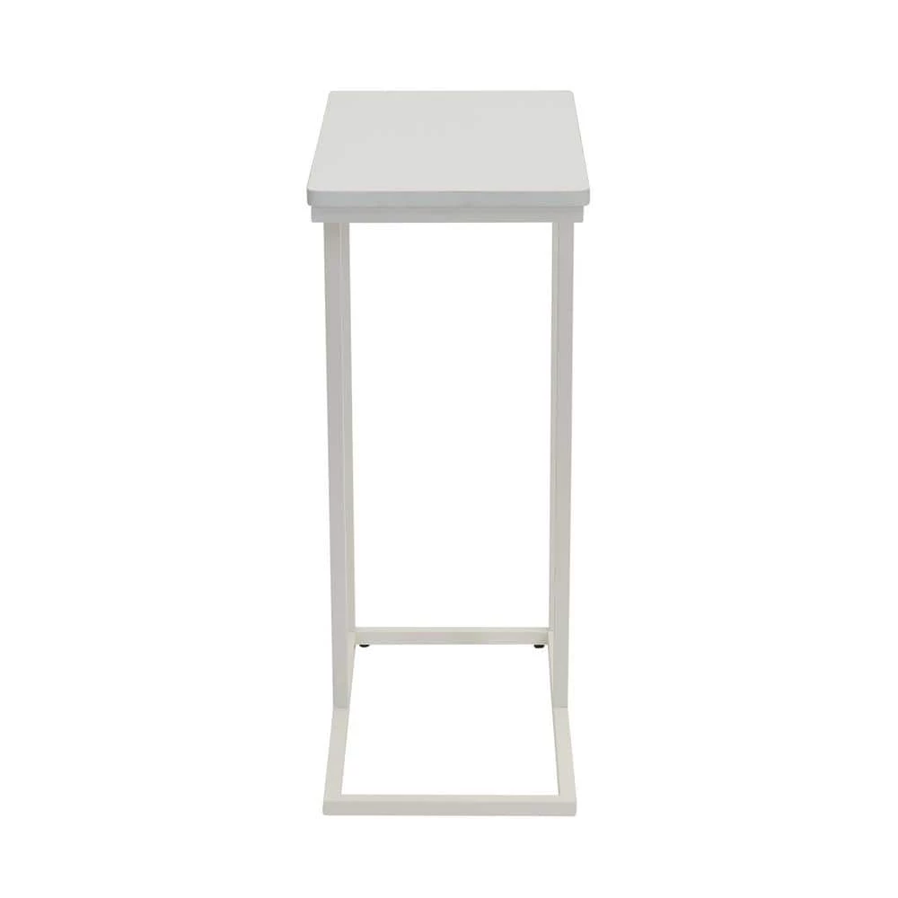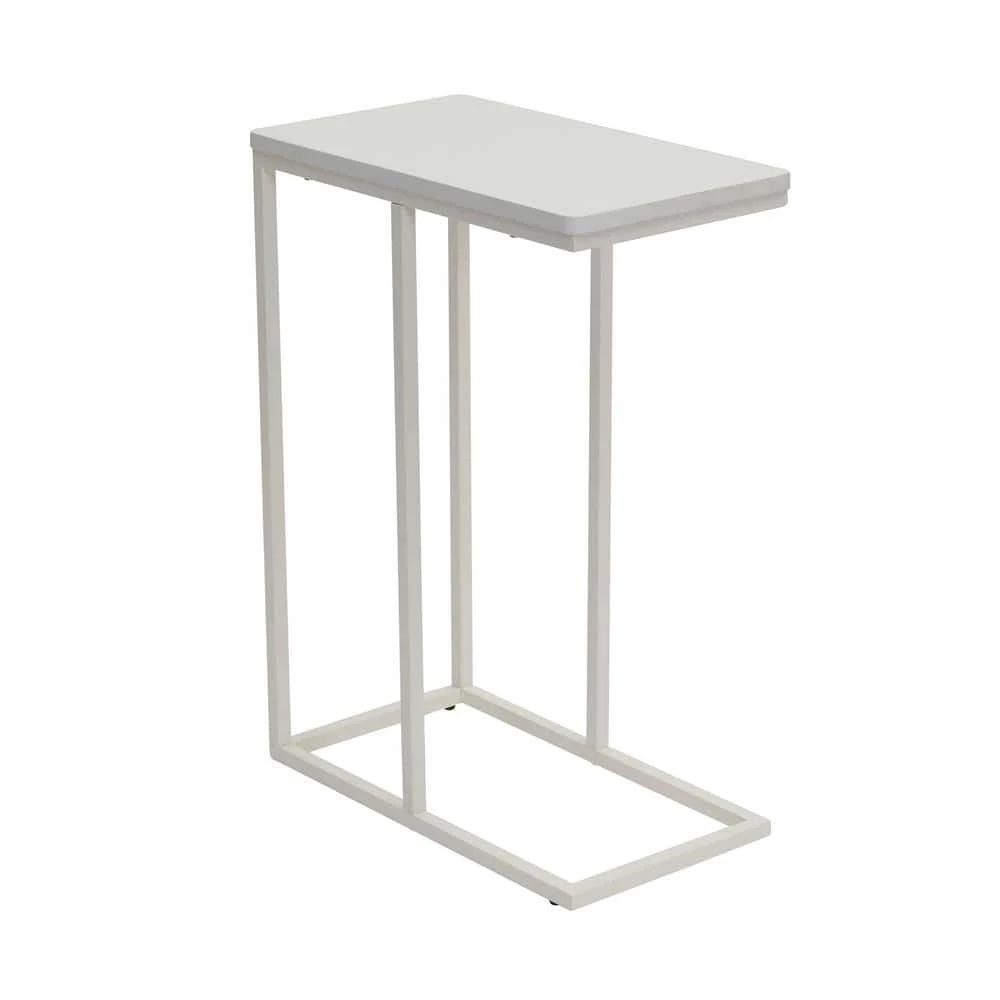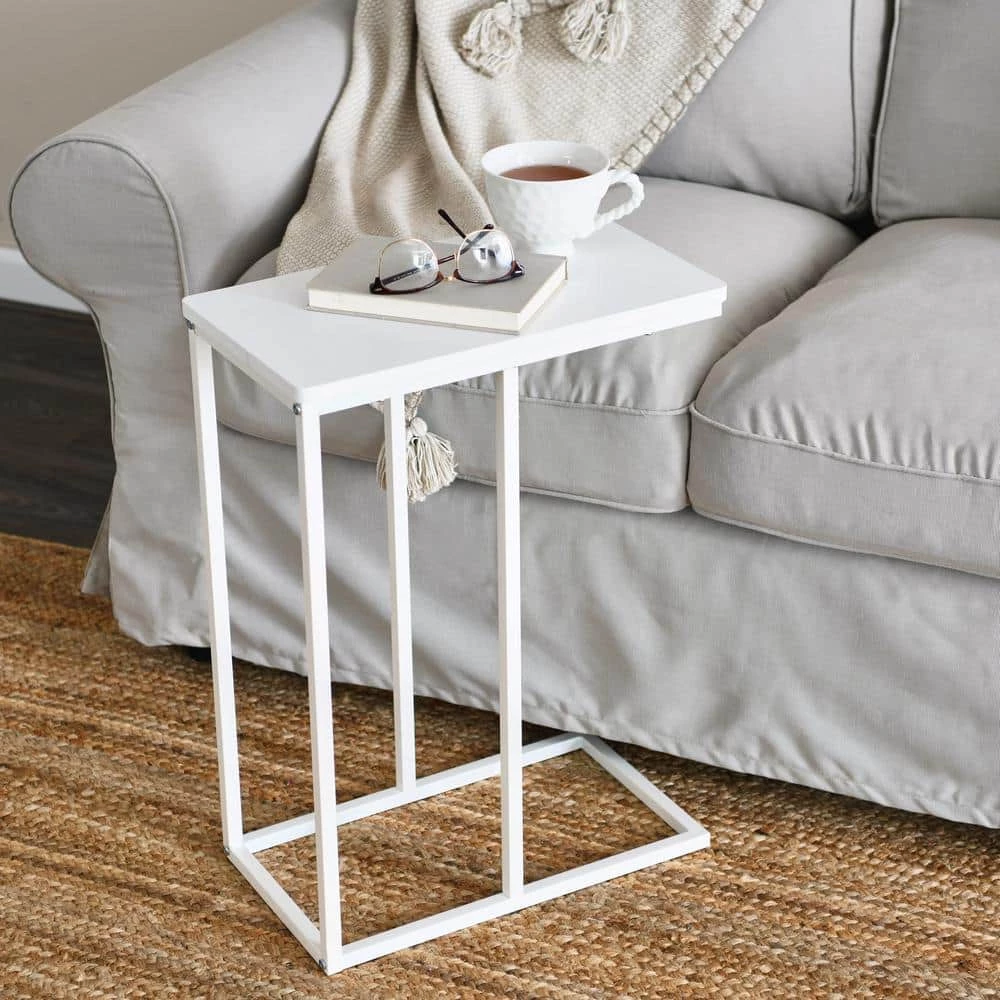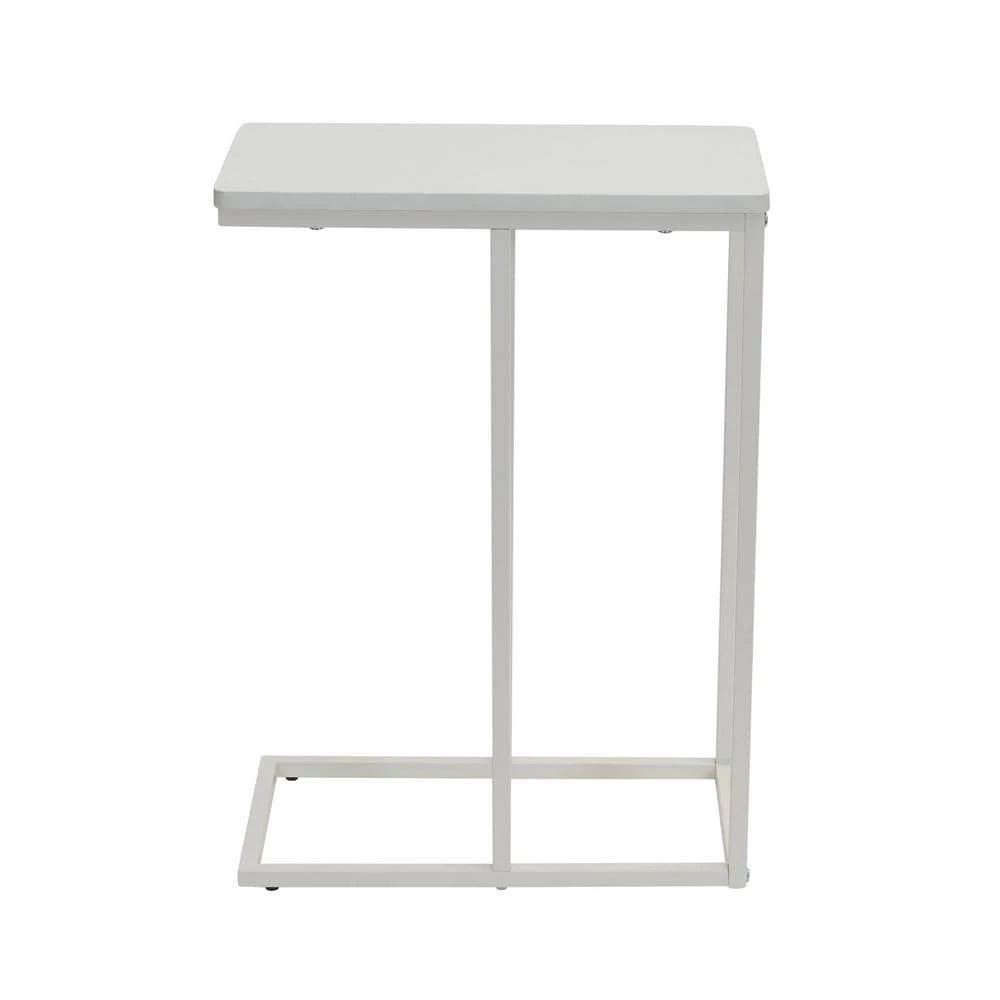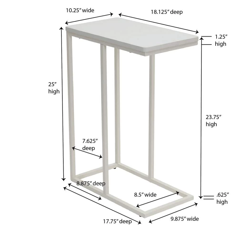 This modern side table’s simplistic style and versatility are perfect as a workspace or additional surface area for your living room, lounge area or office space. The smooth white laminate finish top compliments the table’s white frame, making an attractive addition to your furniture set. The C-shaped design gives this side table a unique functionality. It can be used as the traditional table next to any chair, but you can also angle it over the arm of the couch or your lap for a closer tabletop surface. This will bring the table’s surface closer to you, adding an element of convenient accessibility. The 4-leg support system adds extra stability while maintaining a minimalist style. This side table can be used in any seating area of the home. Use the table to enjoy dinner and a movie with family, work from home on your laptop or finish homework from the comfort of your couch. It can also be used as a corner table to showcase decorative accents such as pictures, house plants, etc. The compact nature of the C-shaped design allows you to push the table’s legs under the couch or chair, which, in addition to bringing the table closer, frees up more walking space around your furniture. This feature is wonderful for smaller homes such as apartments, duplexes and townhouses.