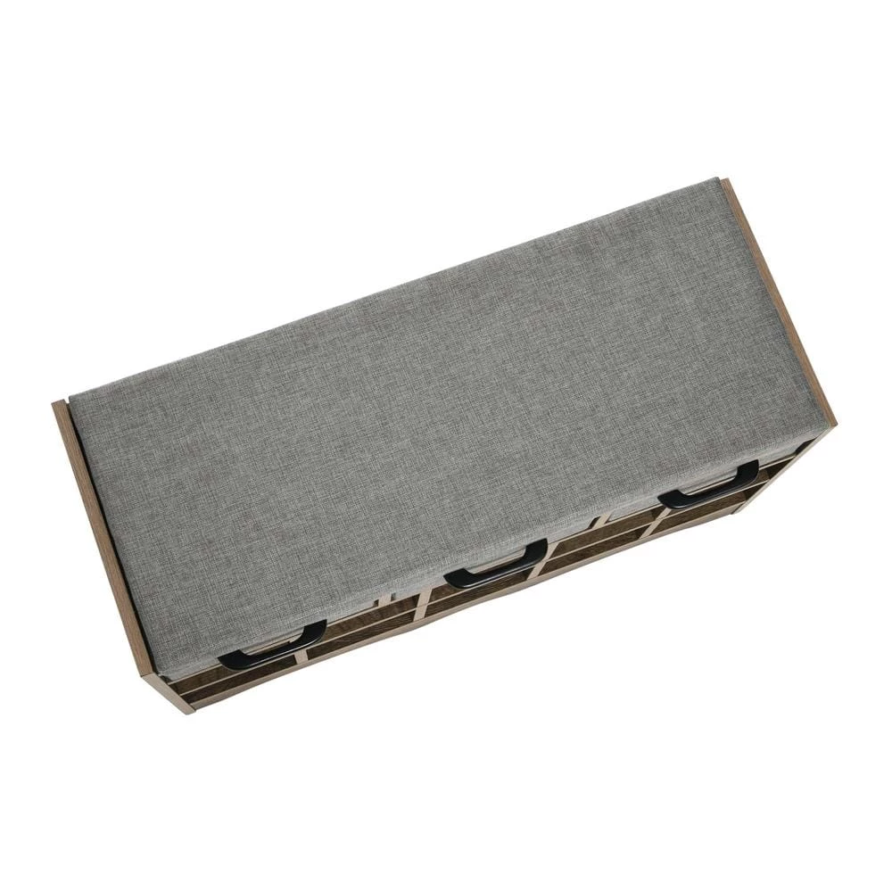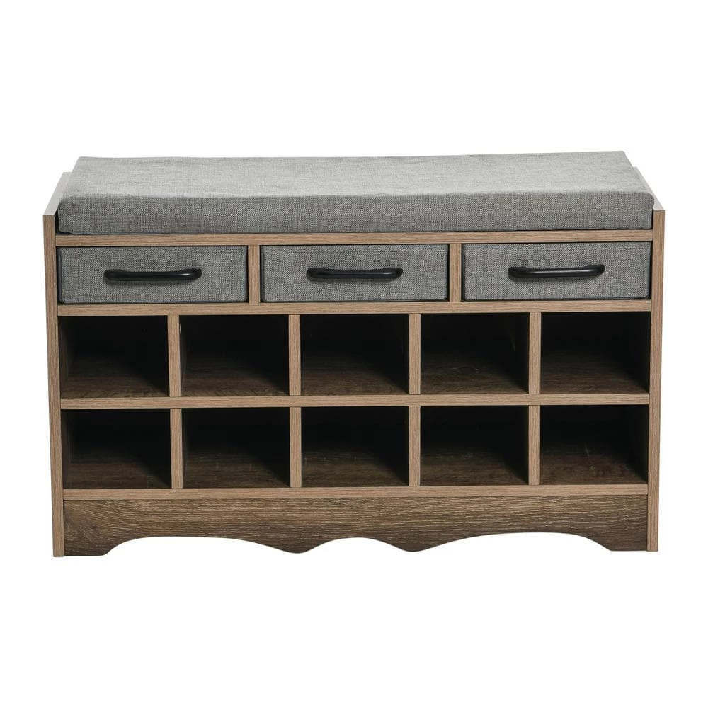 This entryway shoe bench offers precious storage, style, and a comfortable spot to stop, reset or refresh before you leave or after you return to your home. This bench includes 10 cubbies for shoe storage as well as three fabric drawers and is topped with a plush cushion so you can sit as you put on or remove your shoes. The ten cubbies can fit either 10 pairs of small shoes or 5 pairs of larger shoes, or mix and match based on your shoe collection! The three drawers above the cubbies are the perfect spot for additional accessories or things you might need, either particular to your shoe collection or just things to grab on your way out the door! Store extra pairs of socks or shoe cleaning tools, like brushes, cloths, polish and conditioners. You could also store essential entryway items, like keys, gloves, dog leashes and other small items. The cushion on top of the bench provides you with a comfortable spot to sit as you put on or take off your shoes and grab or put away anything else you might need. The bench’s feet run the full length of the bench for extra stability and have a decorative scalloped edge, providing an extra dose of style. Made of high quality engineered wood, the bench is lightweight and easy to assemble and supports weights up to 175 pounds. No matter how small or large your space, this tidy entryway shoe bench will be an essential addition.