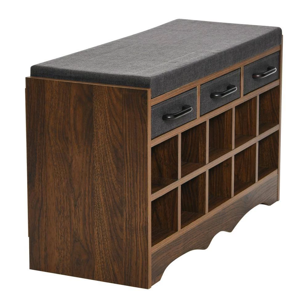 This entryway shoe bench offers precious storage, style, and a comfortable spot to stop, reset or refresh before you leave or after you return to your home. This bench includes 10 cubbies for shoe storage as well as three fabric drawers and is topped with a plush cushion so you can sit as you put on or remove your shoes. The ten cubbies can fit either 10 pairs of small shoes or 5 pairs of larger shoes, or mix and match based on your shoe collection! The three drawers above the cubbies are the perfect spot for additional accessories or things you might need, either particular to your shoe collection or just things to grab on your way out the door! Store extra pairs of socks or shoe cleaning tools, like brushes, cloths, polish and conditioners. You could also store essential entryway items, like keys, gloves, dog leashes and other small items. The cushion on top of the bench provides you with a comfortable spot to sit as you put on or take off your shoes and grab or put away anything else you might need. The bench’s feet run the full length of the bench for extra stability and have a decorative scalloped edge, providing an extra dose of style. Made of high quality engineered wood, the bench is lightweight and easy to assemble and supports weights up to 175 pounds. No matter how small or large your space, this tidy entryway shoe bench will be an essential addition.