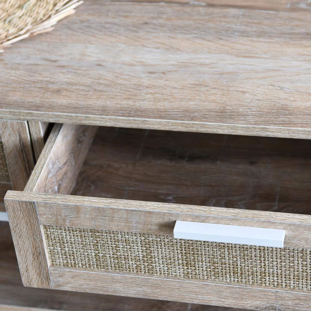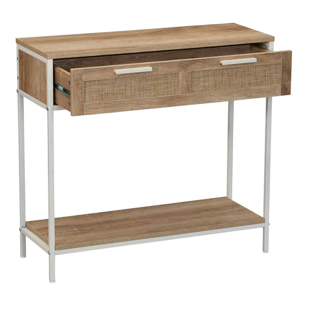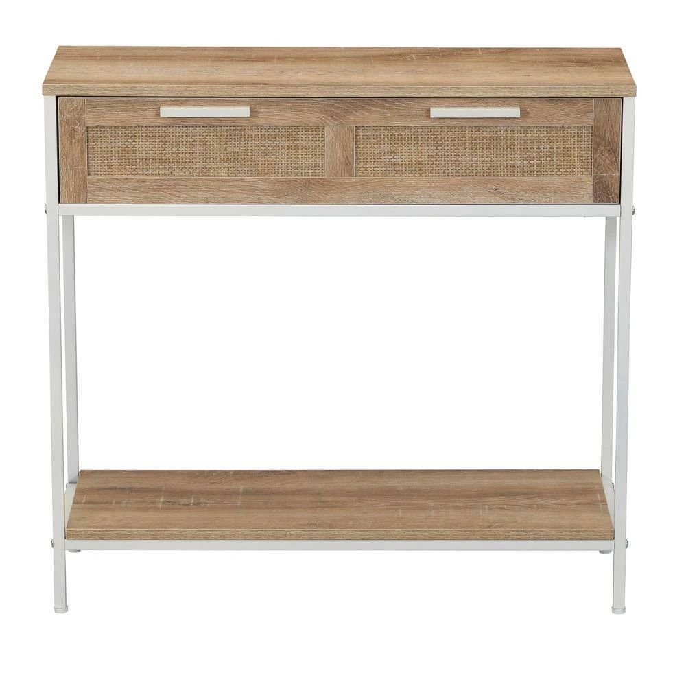 - This 2-tier boho-inspired console table showcases a subtly rustic, narrow tabletop in a coastal oak finish and a single drawer with unique mock rattan detailing set in a sleek, white metal frame