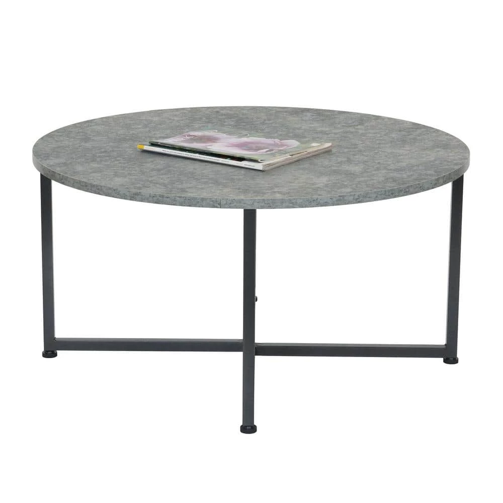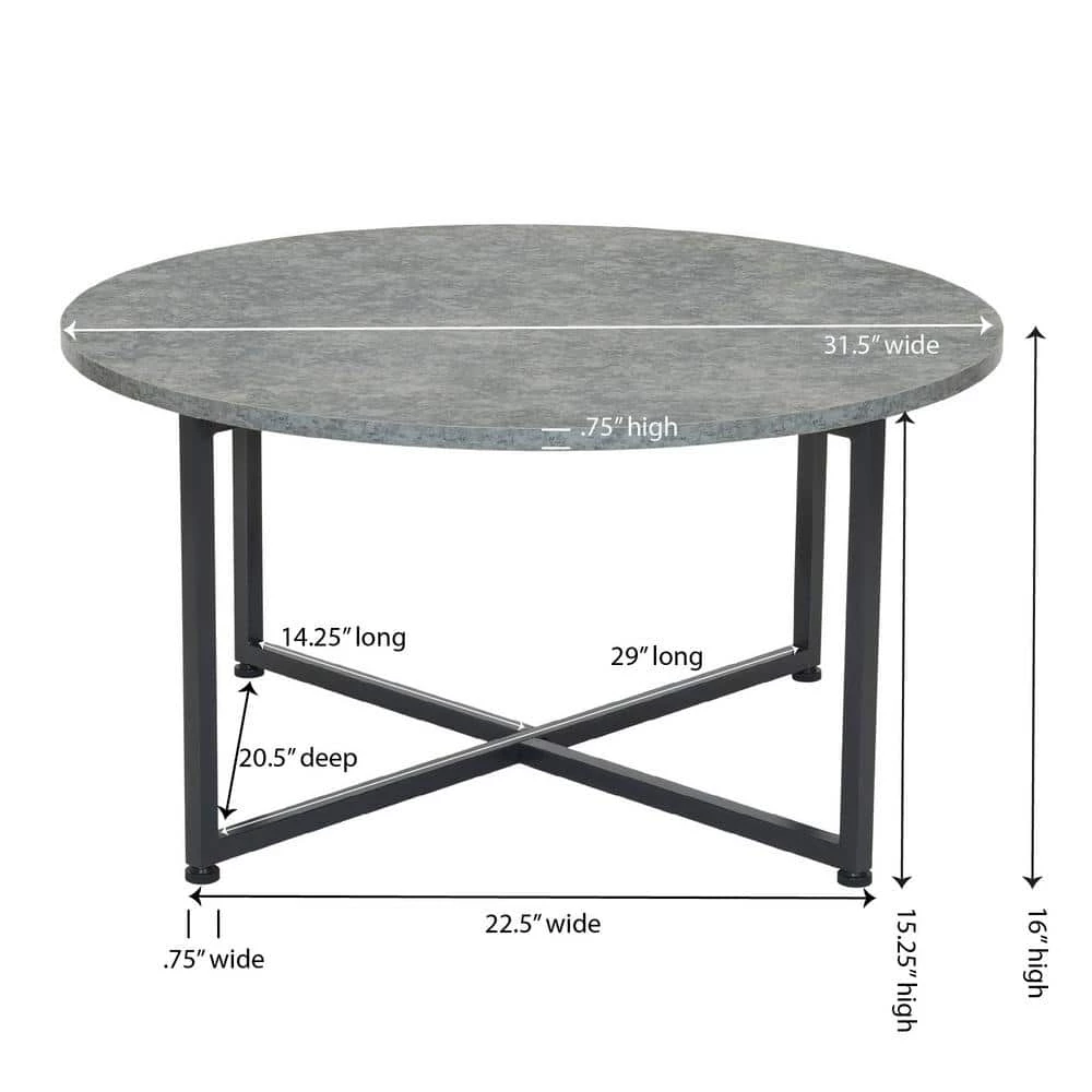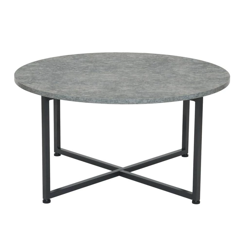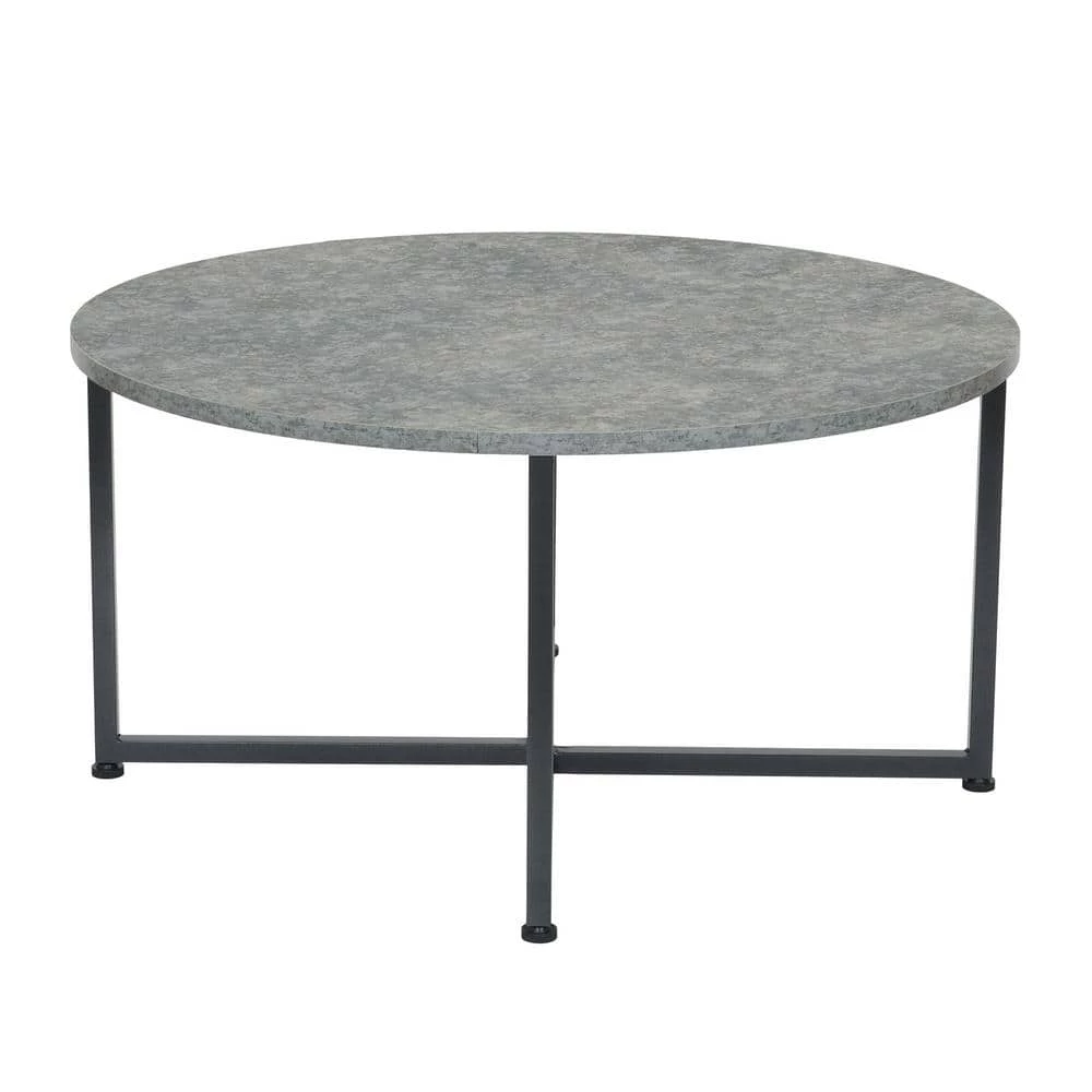 This round coffee table adds the perfect amount of modern minimalist design to any space. The large, round tabletop reaches nearly 31.5 in. diameter, providing ample space for decor, storage and more. The table has a stylish steel frame that crosses at the midpoint underneath the table for added stability and a chic look. The mix of materials and design give it a modern industrial feel and the open frame keeps spaces looking light and airy compared to clunkier coffee tables. With a neutral color scheme and simple design, this table can mesh with a variety of decor styles. The table’s low, round profile makes it ideal for a coffee table, but it can be used in other ways as well. Use it as a large end or corner table or elsewhere in the living room or other common areas. Its round shape means there are no sharp corners to catch on. The tabletop is made of high-quality engineered wood with a faux slate laminate finish. The engineered wood allows the table to be lightweight and the laminate achieves the look of natural stone, but in a material that is much easier to care for. To clean the tabletop, simply wipe with a damp cloth, using a mild cleanser if necessary. The table comes ready to assemble and is easy to put together. This table coordinates with other pieces in the Household Essentials Slate collection. 1-year warranty included.