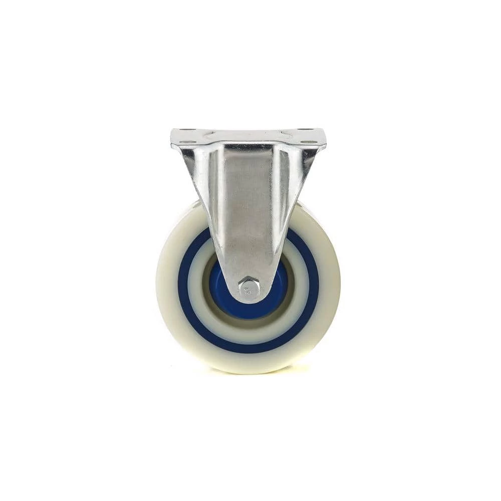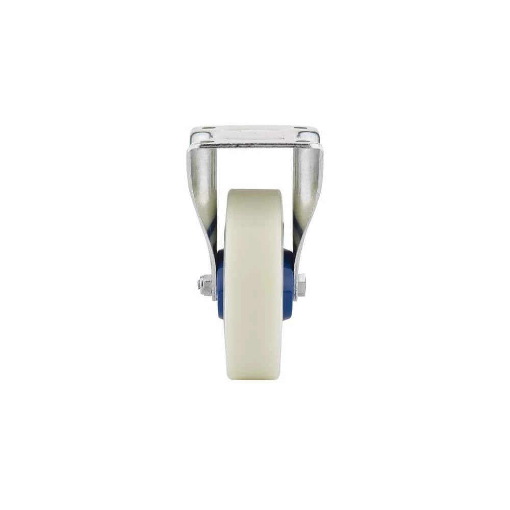 5 in. Polyamide-Rubber Rigid Caster rolls easily with a minimal starting effort. The caster has a protective tread guards, interior and exterior nylon ring and central ring in shock-resistant rubber and has non-marking tread.