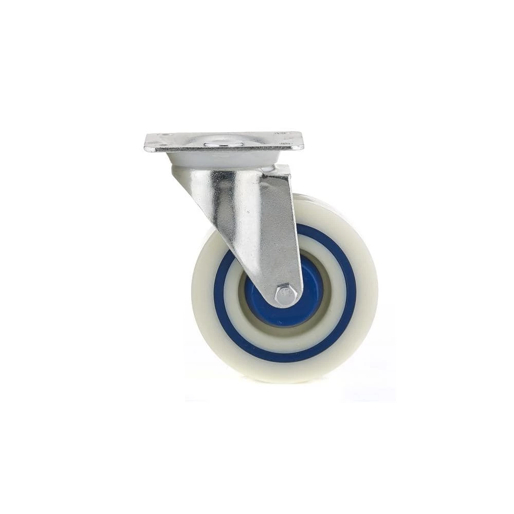 5 in. Polyamide-Rubber Swivel Caster rolls easily with a minimal starting effort. The caster has a protective tread guards, interior and exterior nylon ring and central ring in shock-resistant rubber and has non-marking tread.