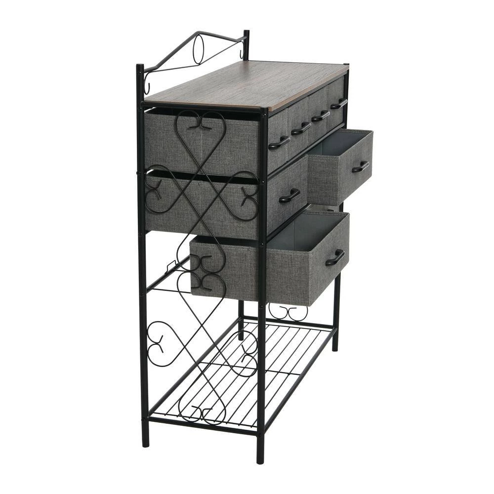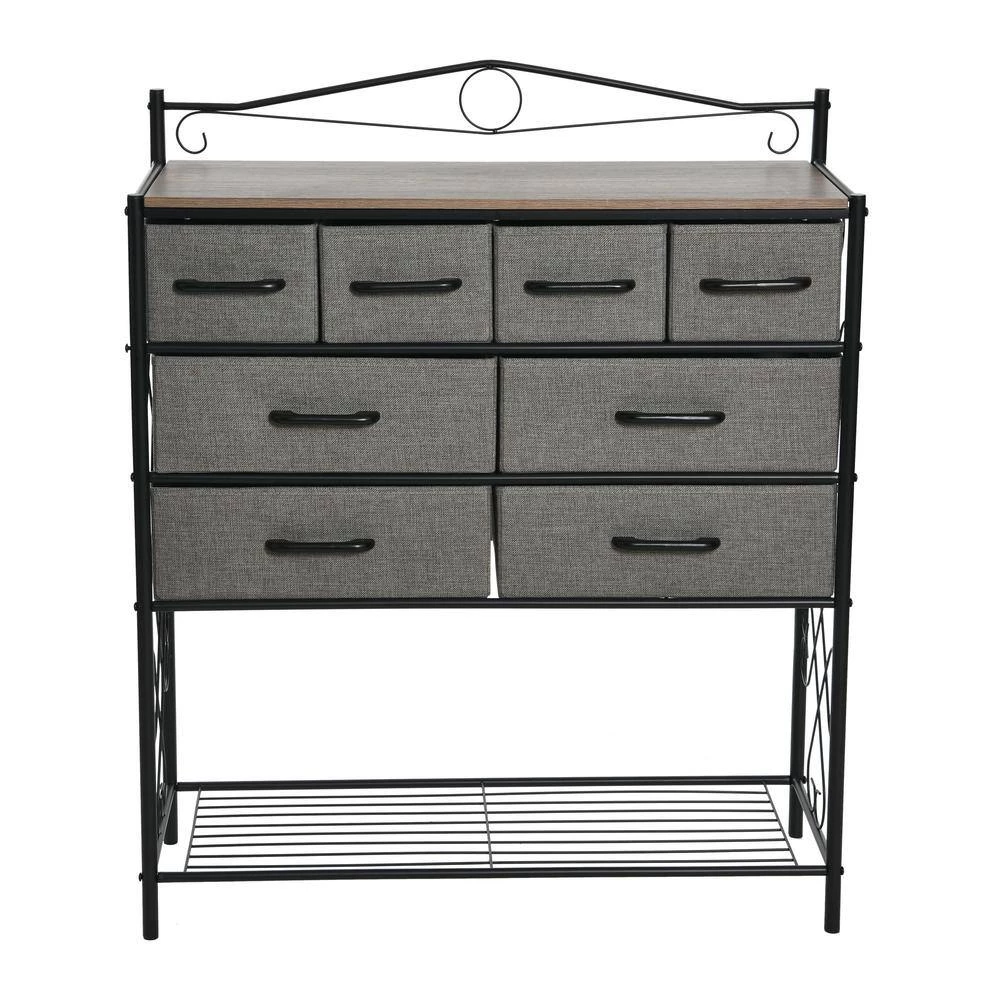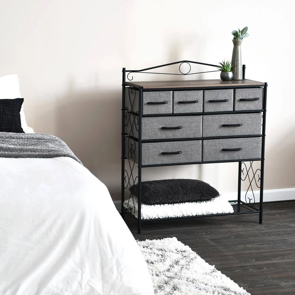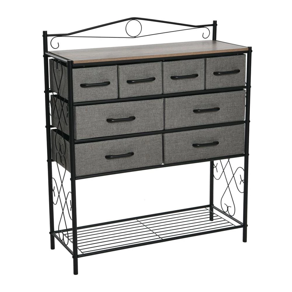 - Features 8-drawers (4-small and 4-large), a black metal frame with Victorian detailing, and bottom storage rack