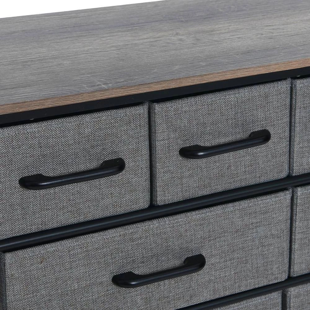 This elegant and versatile wide dresser offers multifaceted storage solutions for any space in your home. With a top shelf, small and large drawers and a lower storage rack, this dresser has a variety of available storage solutions, and the neutral colors and delicate metal detailing are well-suited to blend with different decor styles. The dresser has a black metal frame with scrolling Victorian detailing, giving the dresser a frame that is stylish and sturdy yet lightweight. The top of the dresser is finished with an engineered wood shelf with a laminate finish and a decorative metal back for additional storage space. The dresser comes with 4 small drawers and 4 large drawers that can be rearranged to create a variety of different looks or uses. The bottom portion of the dresser’s frame includes a metal rack that can be utilized in a variety of ways. The rack can hold additional storage bins or baskets, shoes, blankets and more. This wide dresser would be a perfect addition to a room or closet to hold clothing, accessories and shoes, or as a credenza or console in the living room or dining room. Use it in an entryway to hold seasonal accessories such as scarves, sunglasses and hats, shoes, pet accessories, reusable shopping bags or anything else you need to grab or drop when leaving or entering your home. The top shelf is a perfect spot for incoming or outgoing mail, catchalls for keys or change or a charging station for phones, tablets or fitness trackers and watches.