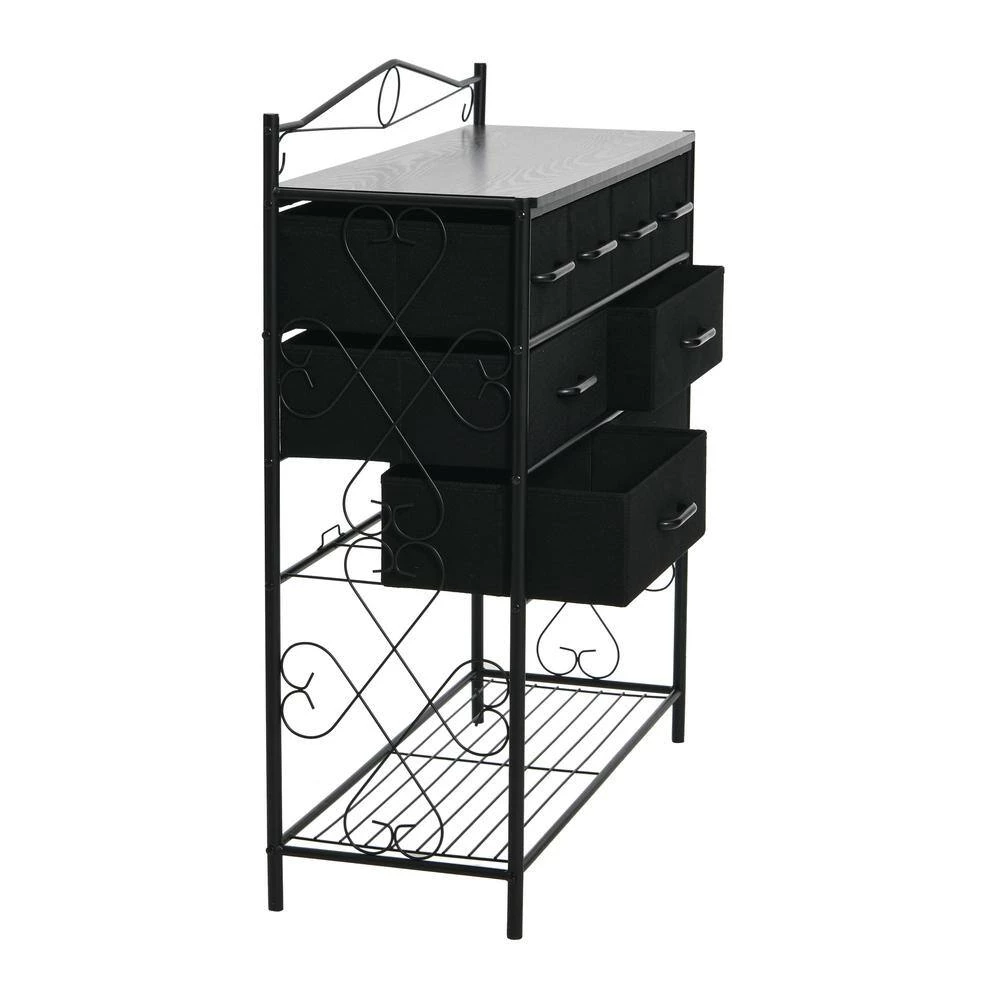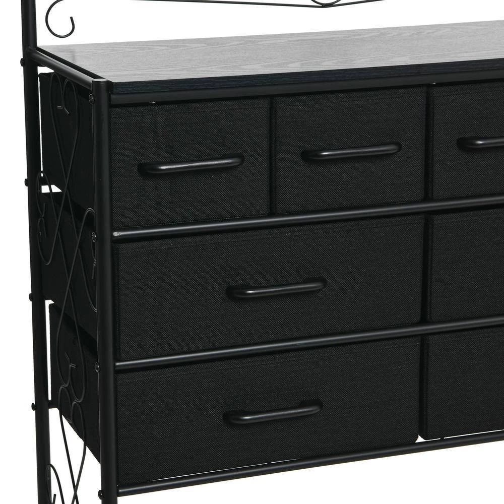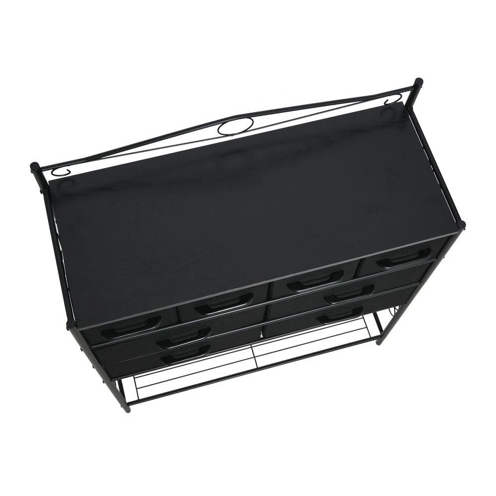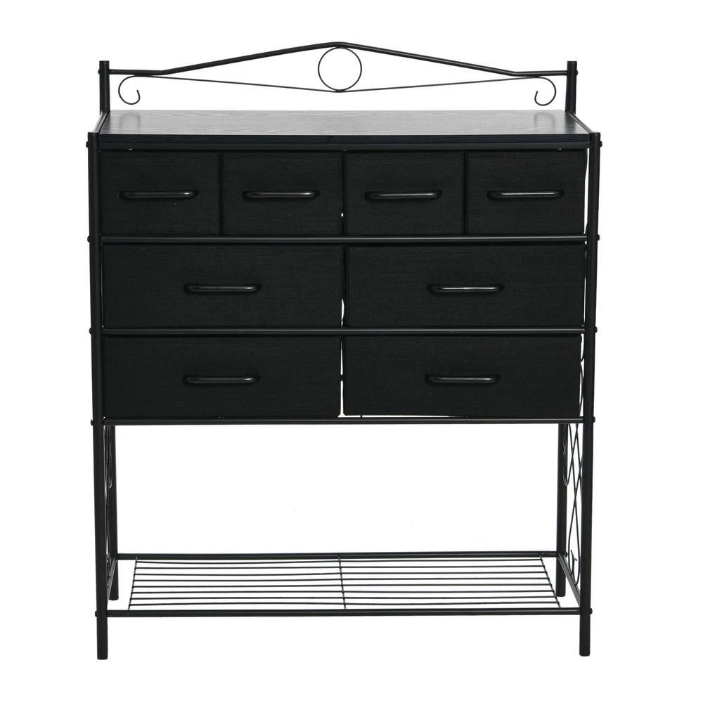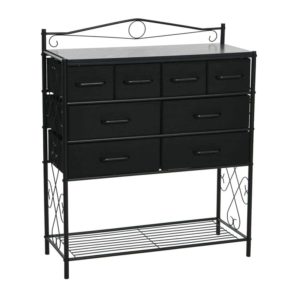 - Features 8-drawers (4-small and 4-large), a black metal frame with Victorian detailing, and bottom storage rack