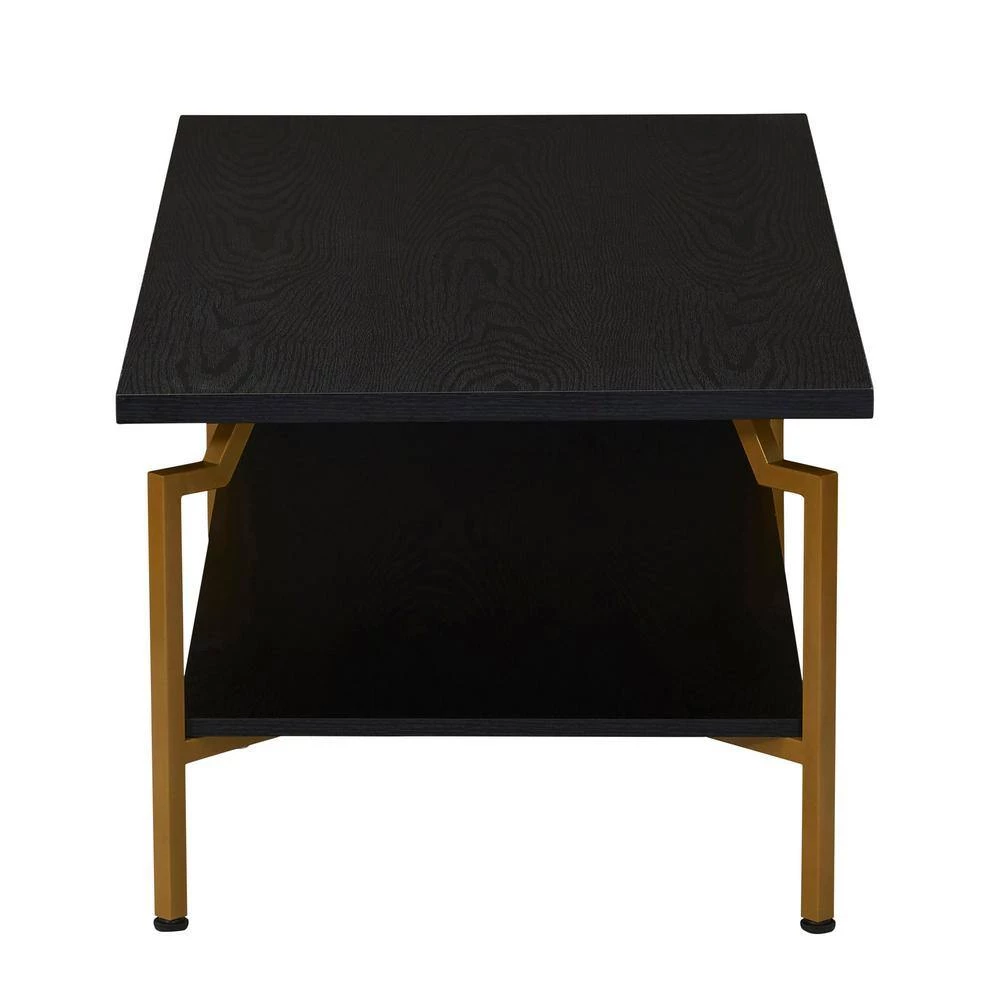 - 2-tier art deco inspired coffee table showcases a sleek, rectangular tabletop in a black oak finish and a stylish gold brushed metal frame