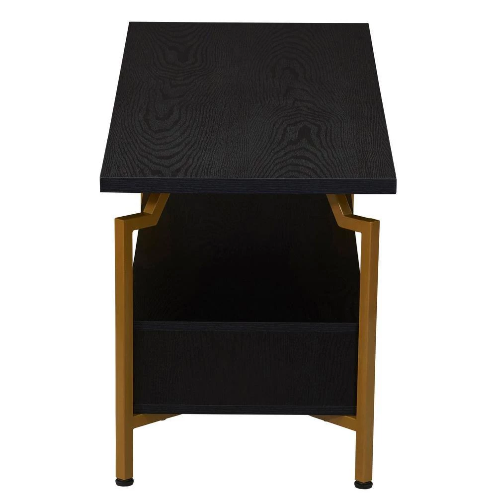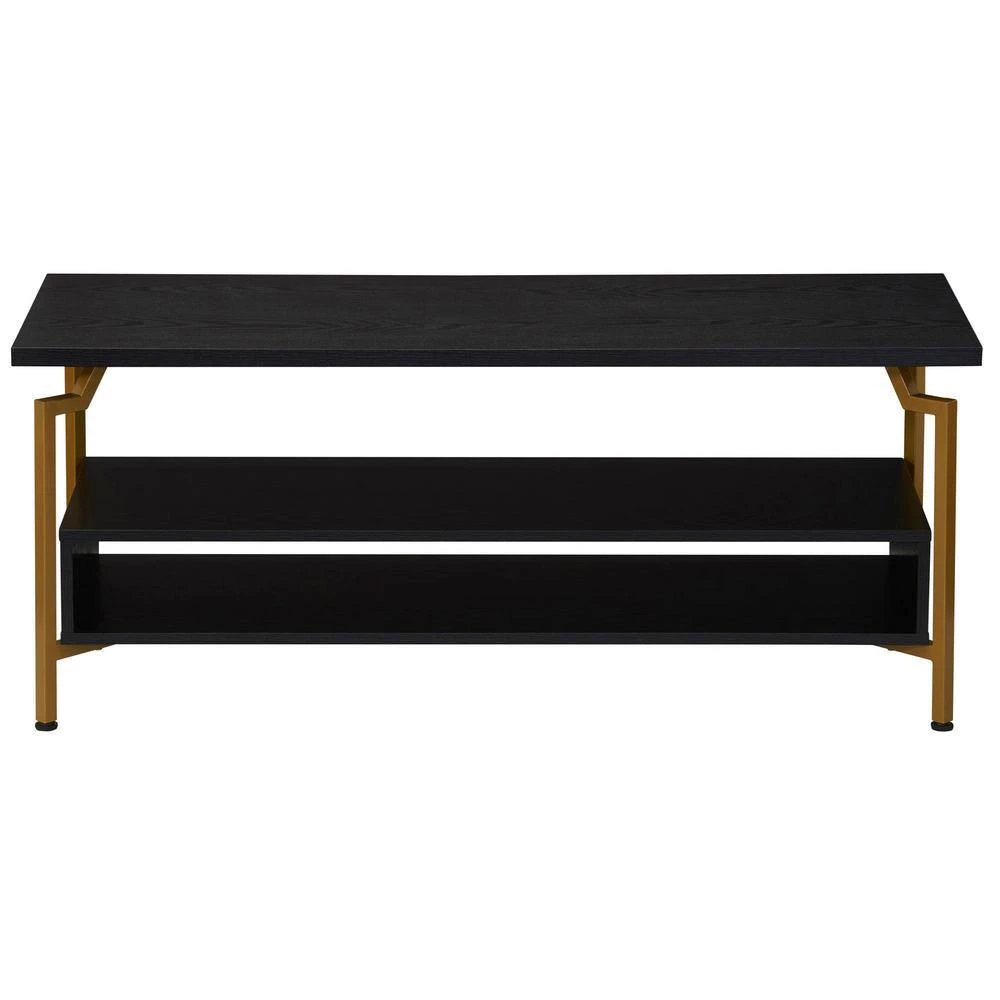 - Art deco inspired TV stand showcases a sleek tabletop and open storage cubby in a black oak finish set in a gold brushed metal frame