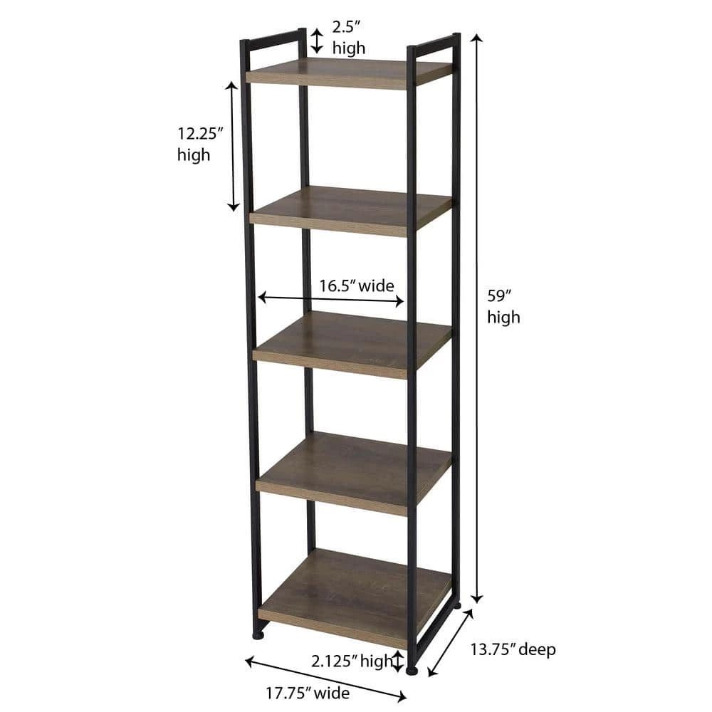 Household Essentials Ashwood Modular 5-Shelf Tower is a freestanding storage tower with 5 square shelves. The 5 shelves are open and smooth. The tower has 2 metal side frames with rounded feet to protect floors. The open side frames create a sense of lightness that is perfect for small areas. The light design can make small spaces feel larger. The straight and simple lines also allow what is on the shelves to draw more attention than the shelves themselves. Perfect for home or office, this attractive shelving unit display case provides an open slate for storage options, giving you free creative reign. The Ashwood Modular 5-Shelf Tower is 59.1 in. high x 17.72 in. wide x 13.8 in. deep coordinates with the full Ashwood Collection.