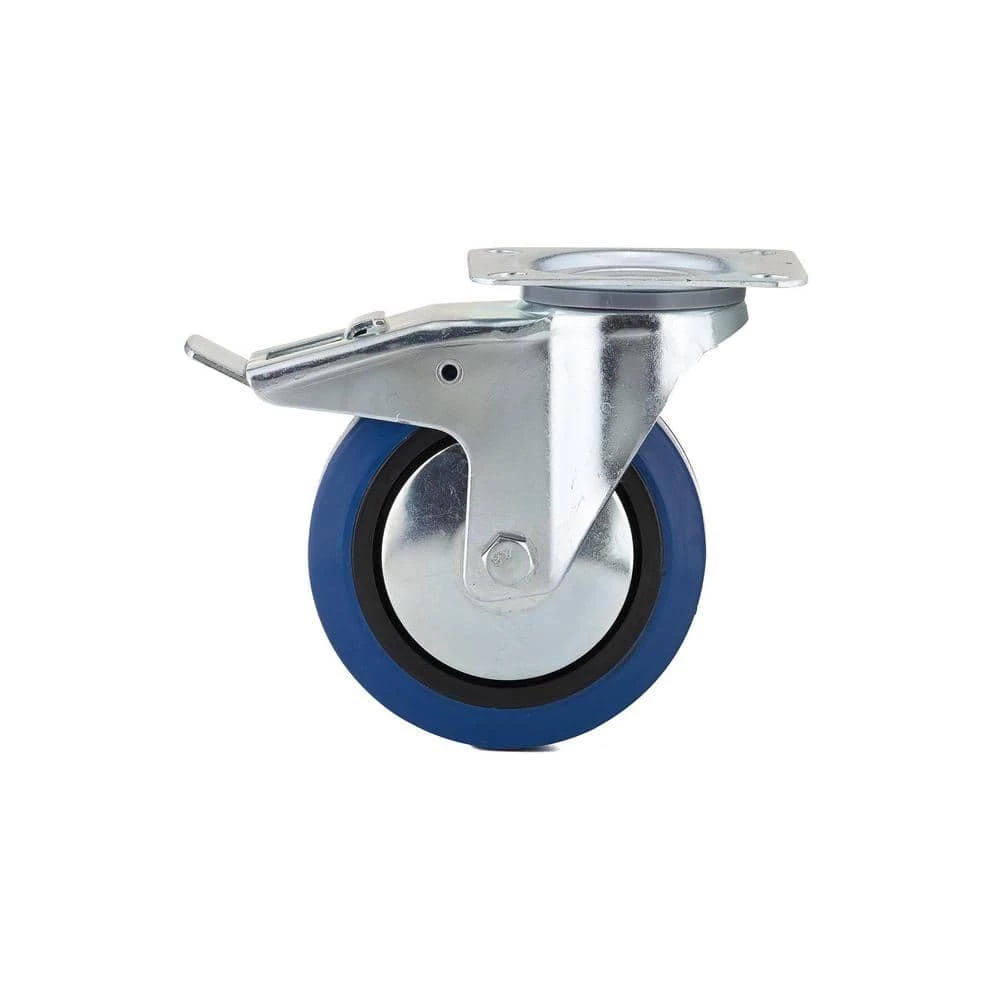These heavy-duty casters are durable and designed for use in the most demanding environments. Double-lock braking system for both the wheel and the swivel. Non-marking rubber tread, metal thread guards, grease seal to hold lubricant and corrosion-resistant zinc finish.