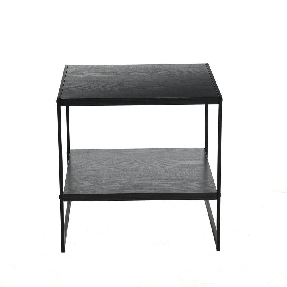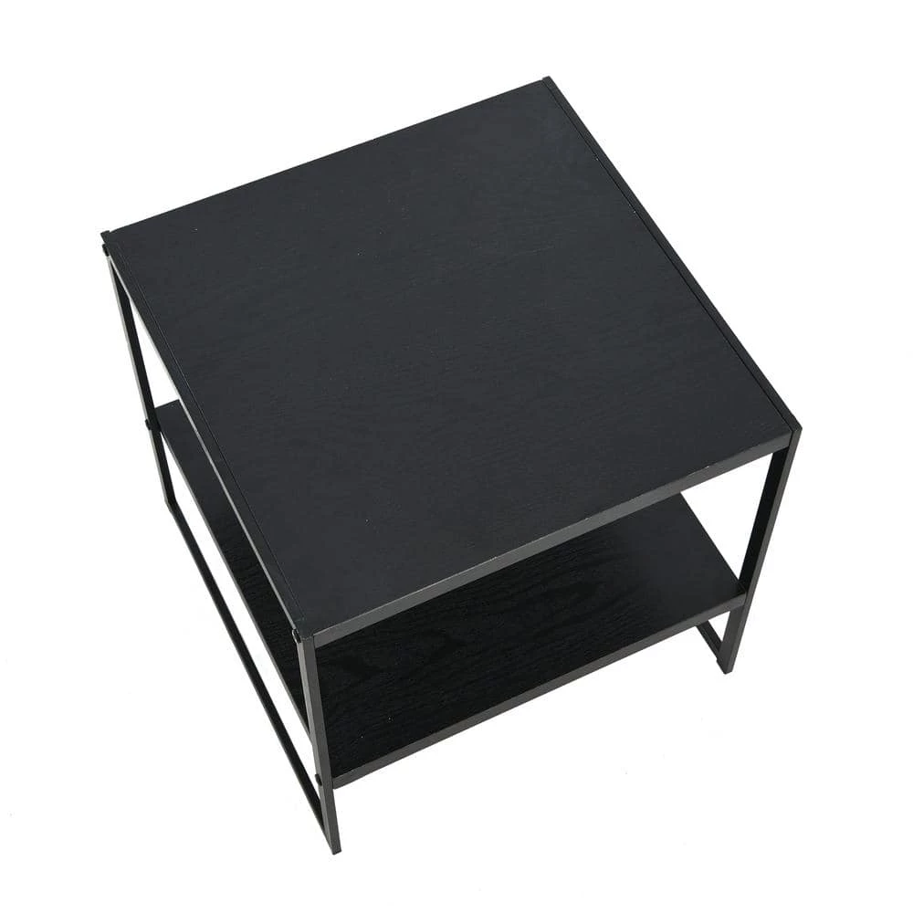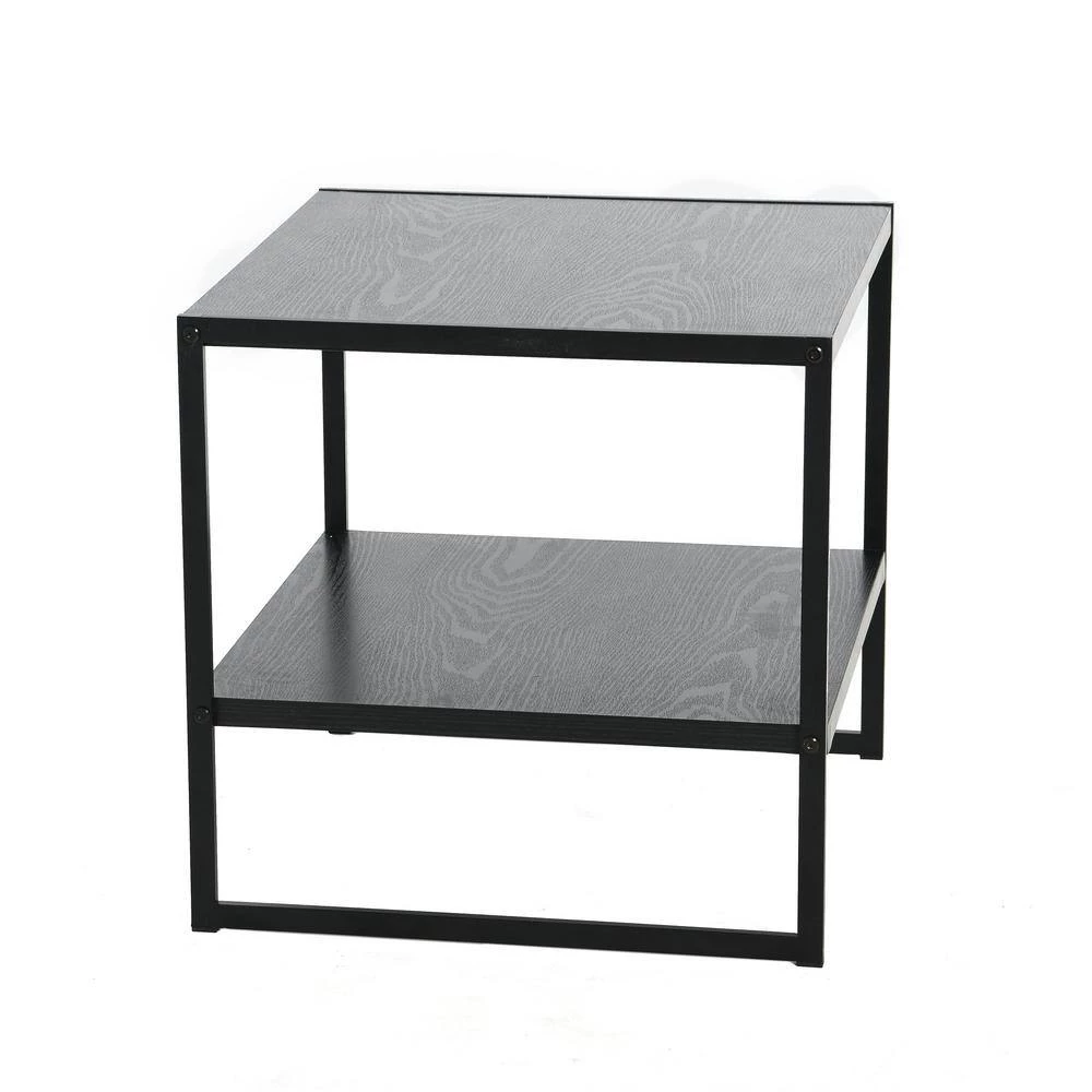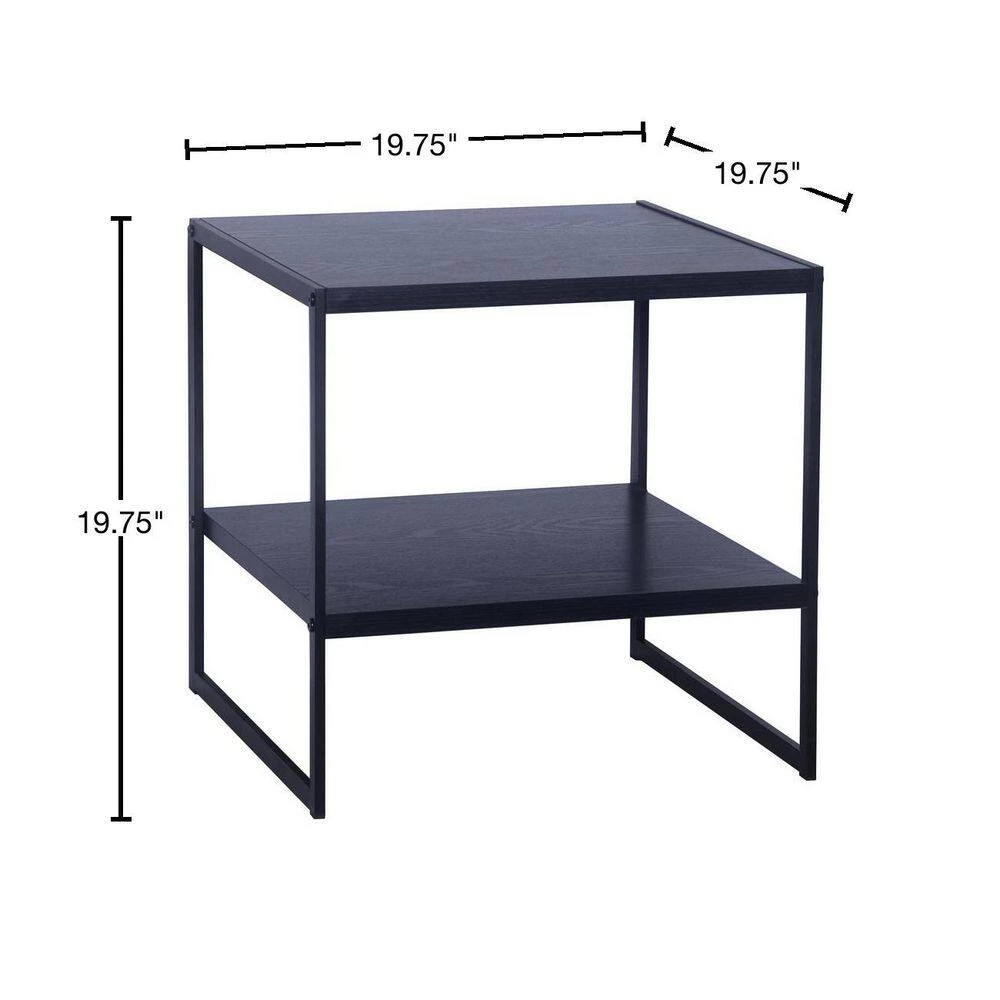 This square end table offers chic storage and stylish design. Its small, square shape fits easily as a side table or end table next to furniture. The 20 inch tabletop and lower storage shelf provide ample space for item storage or display. Use this table to keep items easily accessible but still in their place with purposeful design. This end table has a steel frame with a high quality engineered wood table top and storage shelf. The shelf and tabletop have a laminate exterior in a dark faux woodgrain design. The laminate ensures the tabletop and shelf are durable and easy to wipe clean with a damp cloth. The warm-toned wood grain design adds a natural element that mixes with the metal frame for a sleek, modern restoration look. This square end table has an open, airy design with a table top and shelf that almost appear to float with the minimalist metal frame. This helps prevent the table from looking heavy and clunky in your space, especially in smaller or more crowded spaces. While this piece is popularly used as an end table or side table, its sleek and simple cube design and small profile make it a great choice for a variety of uses. It’s the perfect height for an end or side table, but also as a nightstand or a low profile table in any space. This end table is easy to put together and comes ready to assemble. This piece coordinates with other pieces in the Household Essentials Black Oak Furniture line.