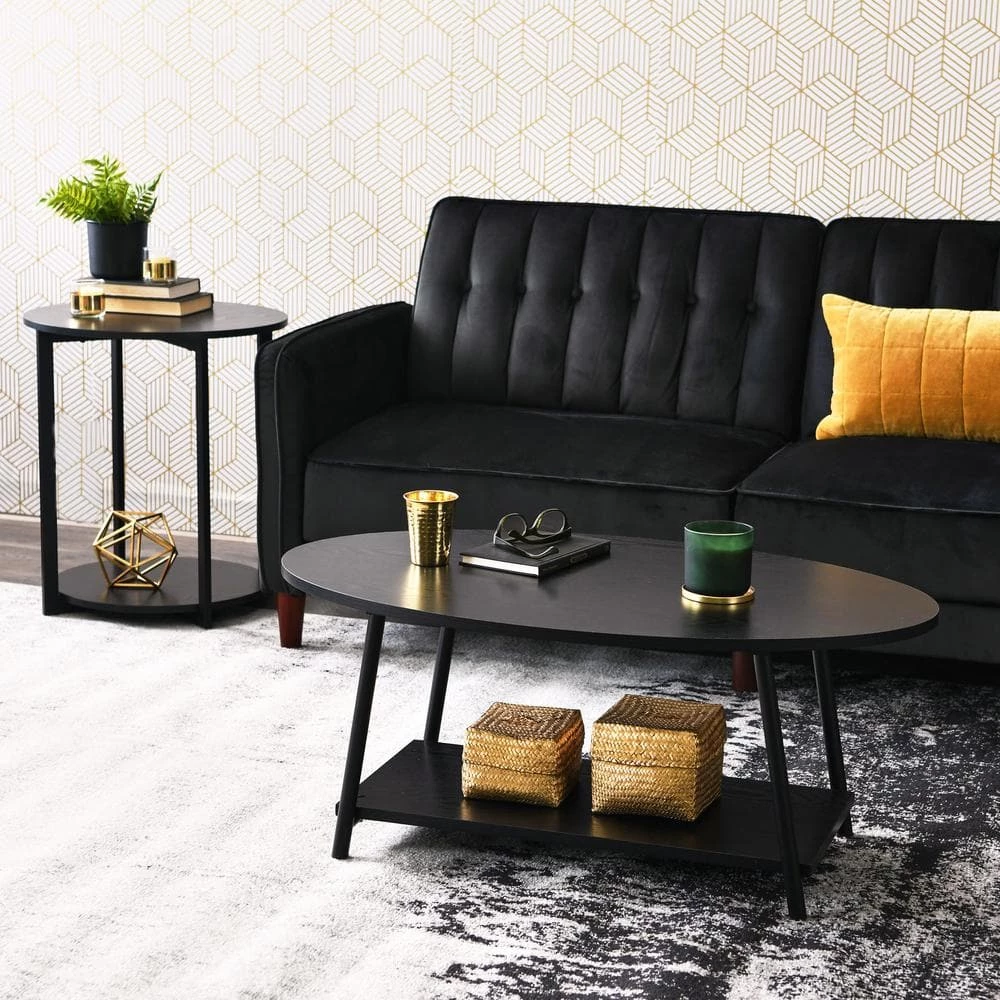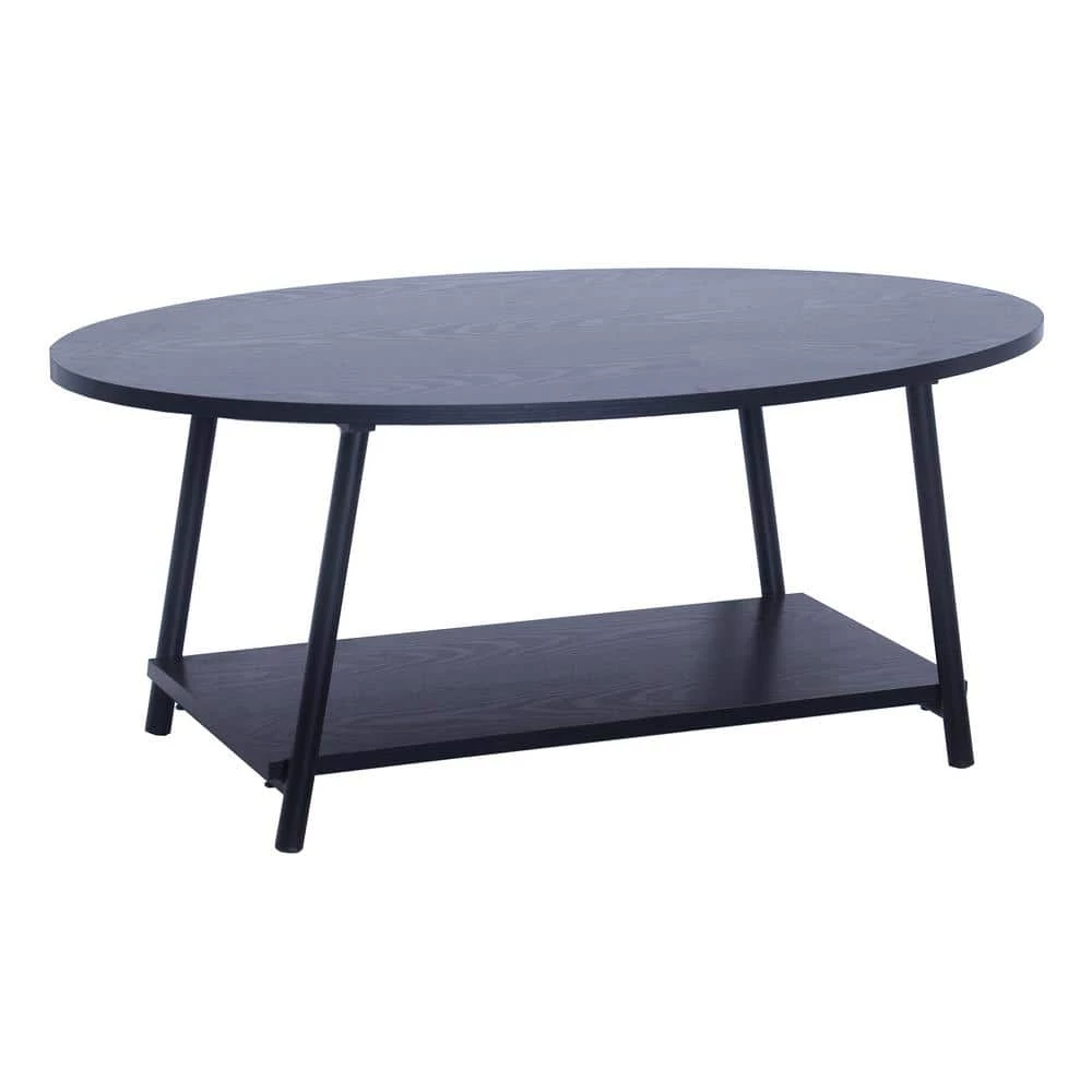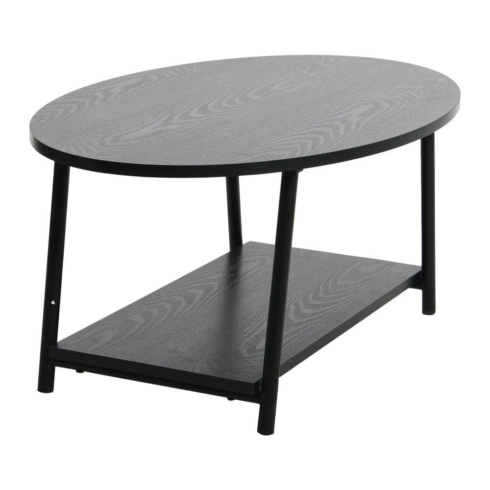 This oval coffee table is a wonderful addition to any home.or space. Its low profile and slim design make it perfect for use as a coffee table, but it could also be used as a side table, as an end table, or elsewhere in the home. The table has a lower storage shelf for ample space to store coffee table books, magazines, remotes, coasters, and any other items you want to keep handy or on display. The table’s oval top and rectangular shelf make for an interesting and modern look. The table has a steel frame with slightly angled legs for a look reminiscent of mid century modern design. The tabletop and shelf are made of high-quality engineered wood with a smooth laminate exterior. The lightweight materials and frame keep the table durable without being heavy, weighing just under 25 lbs., and the laminate makes the table’s surface much more durable and easier to care for than real wood. To clean, simply wipe the surface with a damp cloth. The laminate has a faux dark woodgrain finish with stylish and purposeful distressing for a worn, restorative look. Because the distressing on each piece is unique, your table may vary slightly from the photo examples. The mix of warm-toned faux wood and black metal make for a sleek and chic design. The table comes ready to assemble and is easy to put together. This table coordinates with other pieces in the Household Essentials Black Oak collection. One-year warranty included.