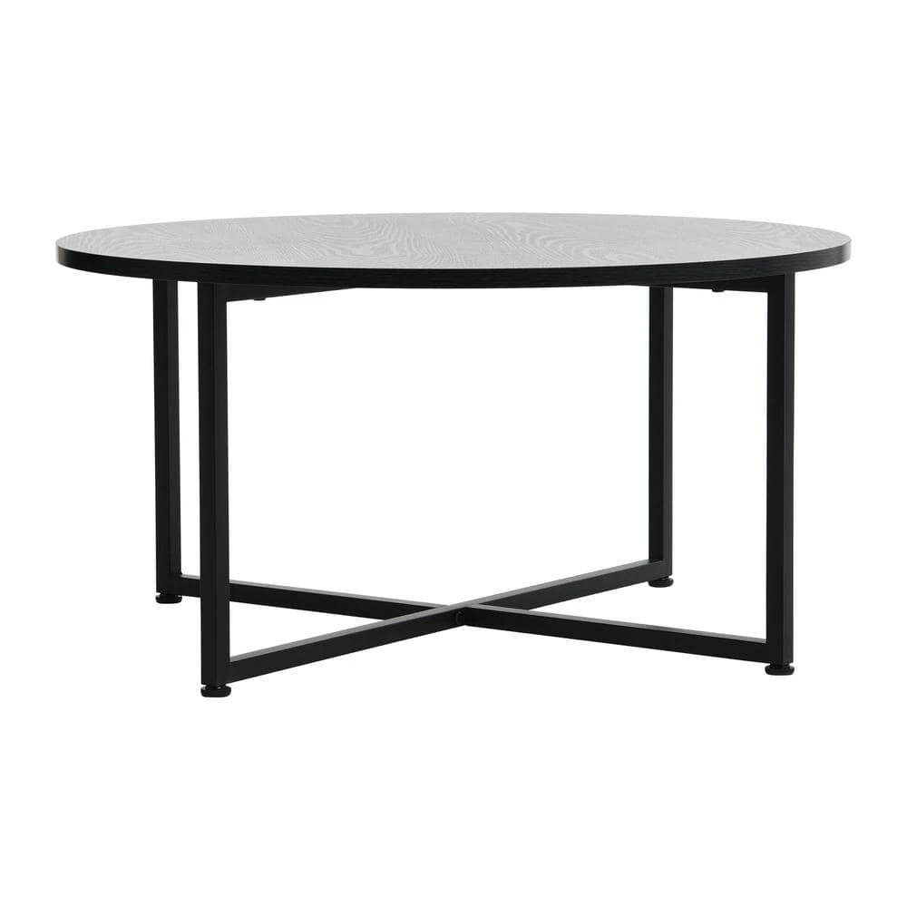 This round coffee table adds the perfect amount of modern minimalist design to any space. The large, round tabletop reaches nearly 32 in. Dia, providing ample space for decor, storage, and more. The table has a stylish steel frame that crosses at the midpoint underneath the table for added stability and a chic look. The mix of materials and design give it a modern industrial feel, and the open frame keeps spaces looking light and airy compared to clunkier coffee tables. With a neutral color scheme and simple design, this table can mesh with a variety of decor styles. The table’s low, round profile makes it ideal for a coffee table, but it can be used in other ways as well. Use it as a large end or corner table, or elsewhere in the living room or other common areas. Its round shape means there are no sharp corners to catch on. The tabletop is made of high-quality engineered wood with a faux light woodgrain finish. The engineered wood allows the table to be lightweight, and the laminate achieves the look of natural hardwood, but in a material that is much easier to care for. To clean the tabletop, simply wipe with a damp cloth, using a mild cleanser if necessary. The table comes ready to assemble and is easy to put together. This table coordinates with other pieces in the HOUSEHOLD ESSENTIALS Black Oak collection. 1-year warranty included.