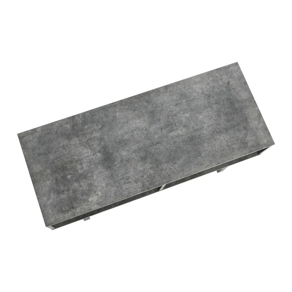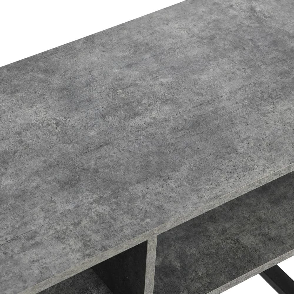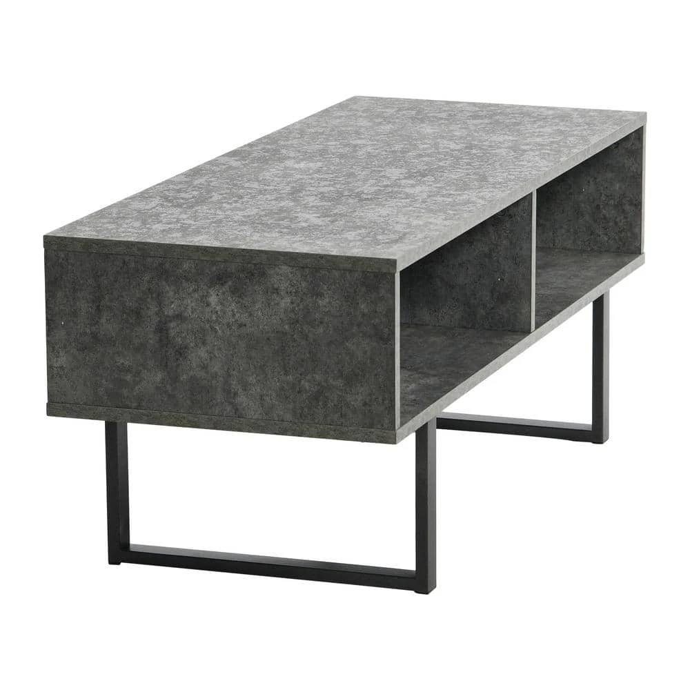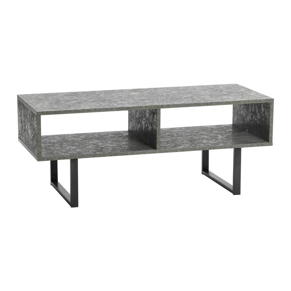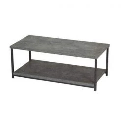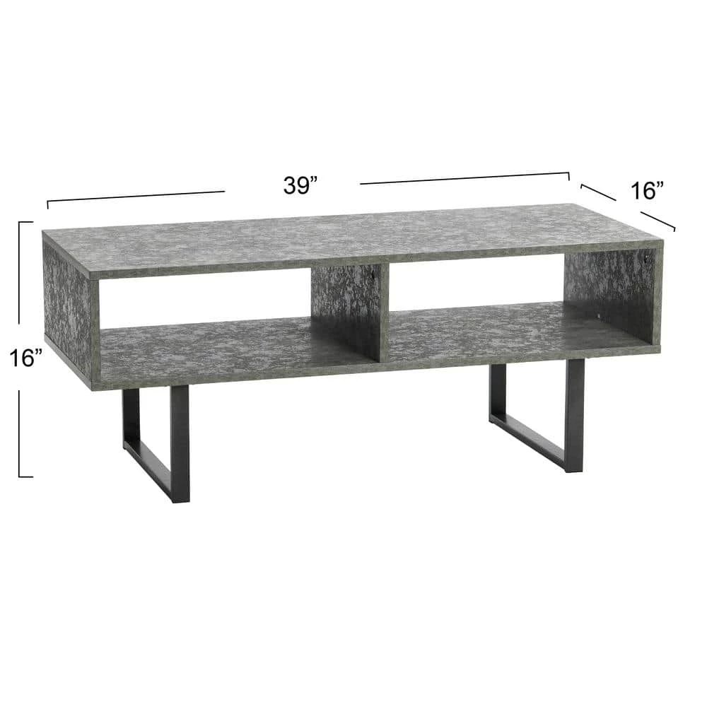 Introduce some composed and sophisticated style to your home or office with the inclusion of this modern coffee table. In addition to making a great coffee table, it can also be used as an entertainment center console, to store blankets and books or to display family pictures. The table is made of sturdy yet lightweight engineered wood with an attractive faux slate finish laminate. The laminate is fashionably distressed to create a pleasing contrast with the table’s modern style. This lightweight material makes assembly easy and relocating the table a piece of cake. The fiberboard construction and squared legs work together to create a stable design to keep your things safely in place. The open tabletop and two lower compartments provide an ample amount of space to store and display all types of items. This coffee table could be placed in the living room or bedroom to house your entertainment center, store various essentials and display pictures. It can also be a great addition to an office space to pull your lounge area together. If you are looking for a coffee table with structure and a clean design, this modern coffee table is a perfect choice. It has various possible functions and a great deal of potential storage space that will help complete any room while helping you stay organized.