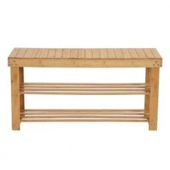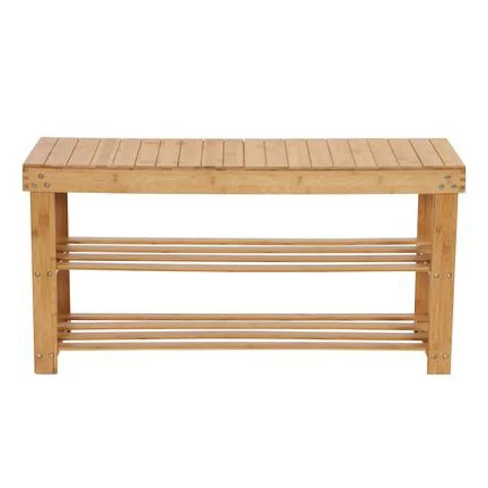 Household Essentials Bamboo 2-Shelf Storage Bench Seat is an open bench seat with 2-storage shelves underneath. The slats in the bamboo seat fun front to back on the bench. The slats in the shelves run side to side. It is a simple, straightforward bench: strong, steady and sturdy. Perfect for entryways, mudrooms and covered porches or decks as seating and as a shoe rack. Or keep the bench in the living room or kitchen as a seat or plant stand. With clean lines, quality bamboo and sturdy construction, this versatile bench is just what you want at home. This artful storage bench is 17.56 in. H, 35.2 in. W and 11.4 in. D.
