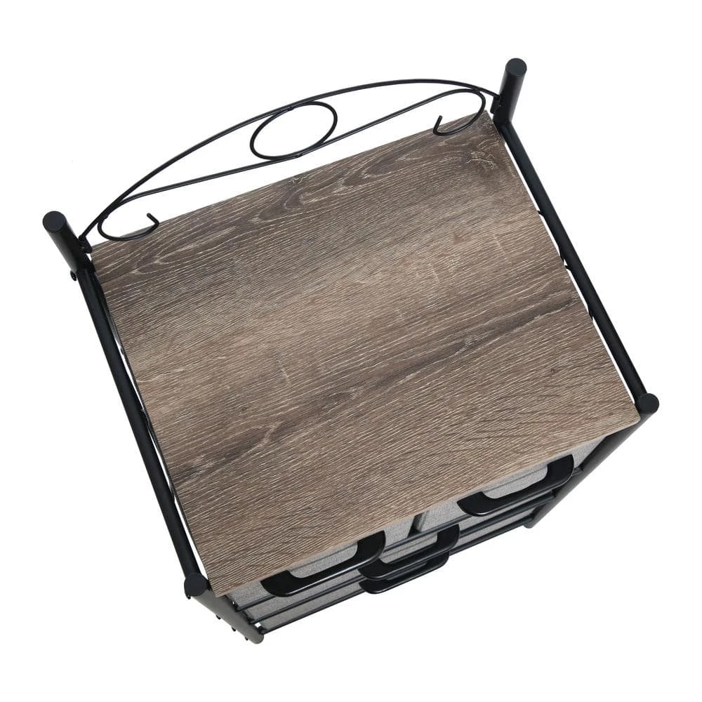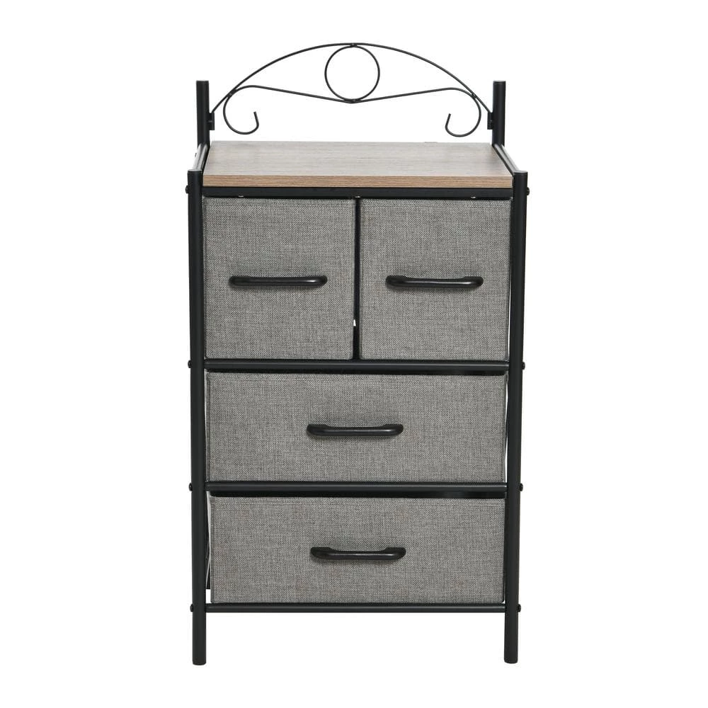 - Features 4-drawers, black metal frame with flourishes and laminate top
