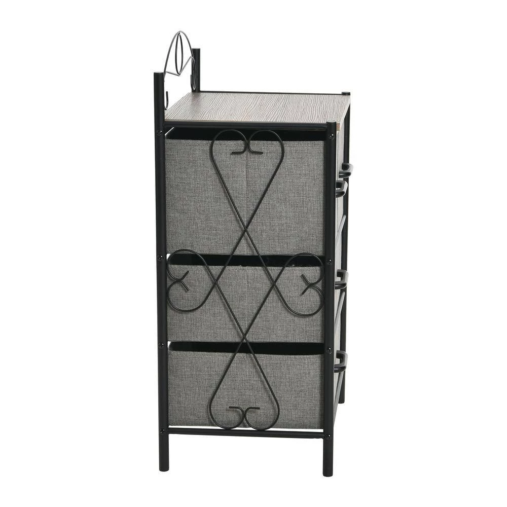 This storage tower is a practical organization solution for any space. The tower comes with 2 medium drawers and 2 large drawers that can be rearranged in the tower to create a variety of looks. Aside from the top 2-drawers, the lower drawers can be placed in any order. The tower’s frame is made of sturdy black metal with decorative flourishes for a sophisticated touch. On top of the drawers is a wood laminate shelf in a ashwood finish for additional storage space. The drawers come in classic light gray colors to match the warm complementary ashwood wood laminate. Each drawer has a durable black plastic handle that coordinates with the black metal frame. Comes ready to assemble and is easy to put together. Includes anti-tipping hardware.