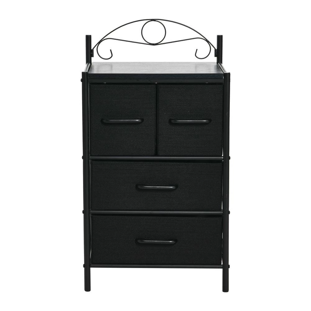 - Features 4-drawers, black metal frame with flourishes and ashwood laminate top