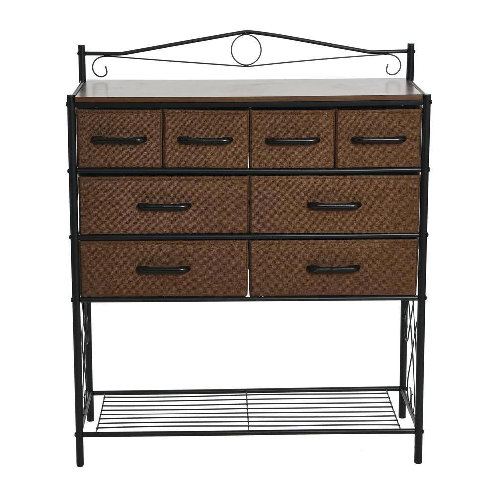 - Features 8-drawers (4 small and 4-large), a black metal frame with Victorian detailing, and bottom storage rack