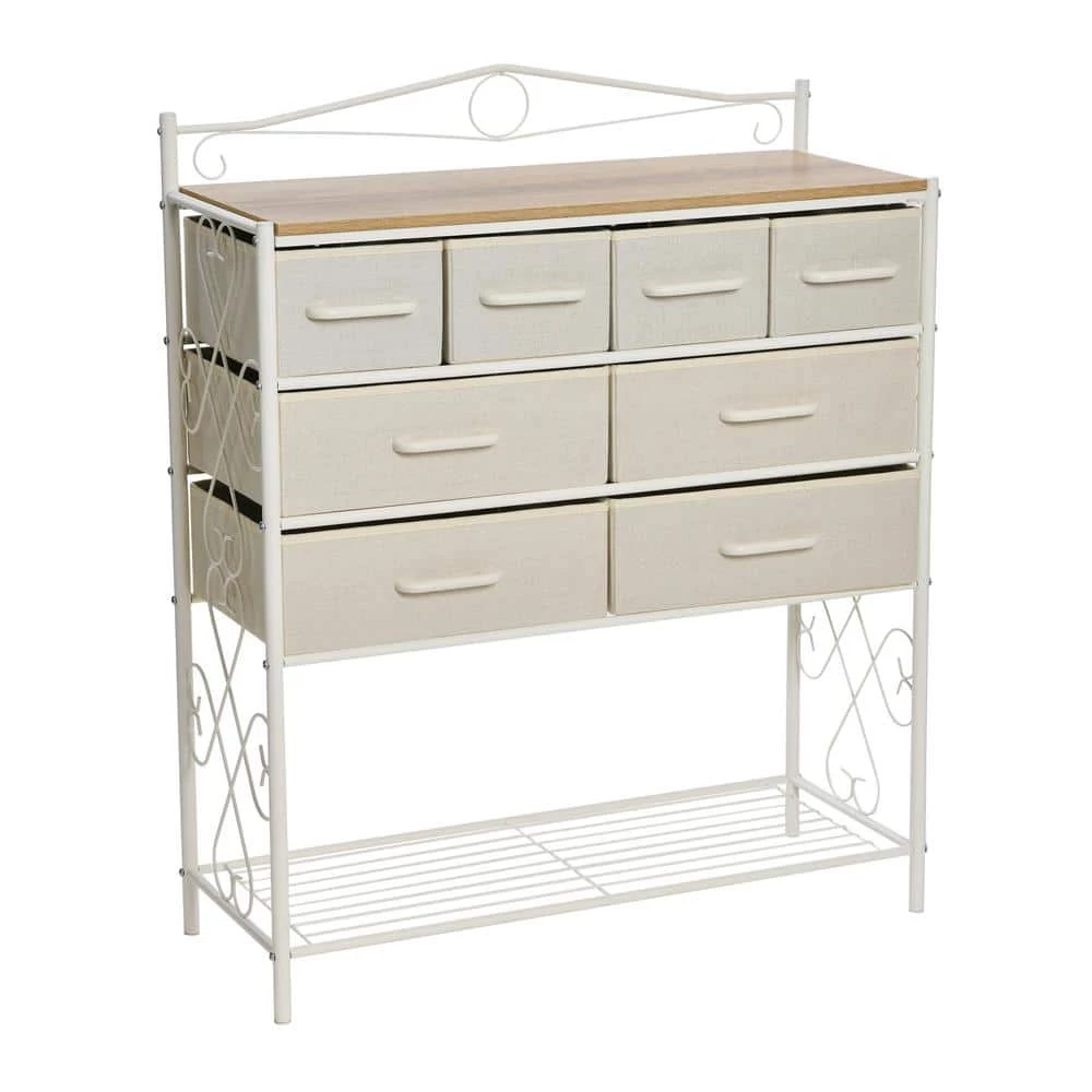 This elegant and versatile wide dresser offers multifaceted storage solutions for any space in your home. With a top shelf, small and large drawers and a lower storage rack, this dresser has a variety of available storage solutions, and the neutral colors and delicate metal detailing are well-suited to blend with different decor styles. The dresser has a black metal frame with scrolling Victorian detailing, giving the dresser a frame that is stylish and sturdy yet lightweight. The top of the dresser is finished with an engineered wood shelf with a laminate finish and a decorative metal back for additional storage space. The dresser comes with 4-small drawers and 4-large drawers that can be rearranged to create a variety of different looks or uses. The bottom portion of the dresser’s frame includes a metal rack that can be utilized in a variety of ways. The rack can hold additional storage bins or baskets, shoes, blankets and more. This wide dresser would be a perfect addition to a room or closet to hold clothing, accessories and shoes, or as a credenza or console in the living room or dining room. Use it in an entryway to hold seasonal accessories such as scarves, sunglasses and hats, shoes, pet accessories, reusable shopping bags or anything else you need to grab or drop when leaving or entering your home. The top shelf is a perfect spot for incoming or outgoing mail, catchalls for keys or change or a charging station for phones, tablets or fitness trackers and watches.